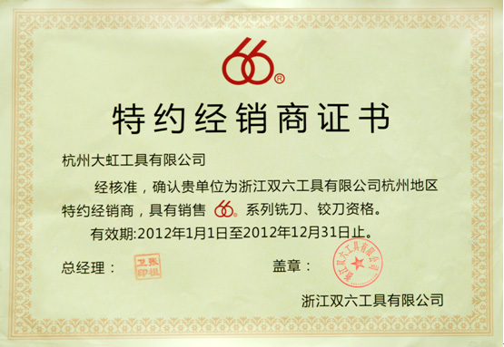 杭州大虹工具有限公司,獲得:浙江雙六工具有限公司特約經銷商。